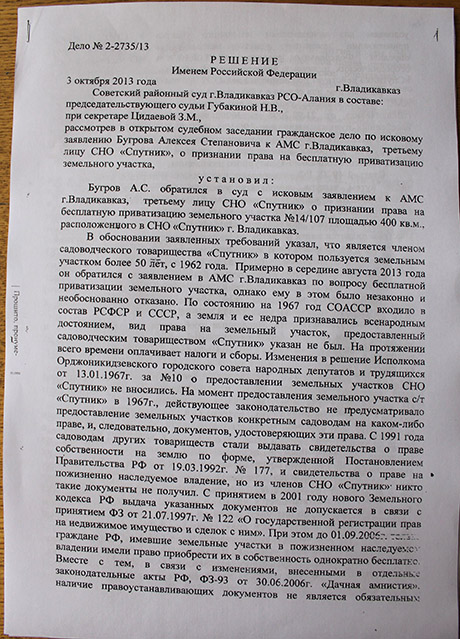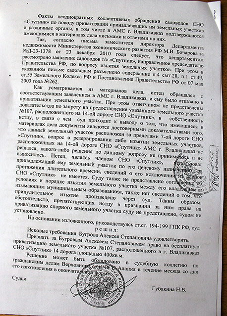 Прикладываю решение районного суда по участку в садоводческом товариществе Спутник